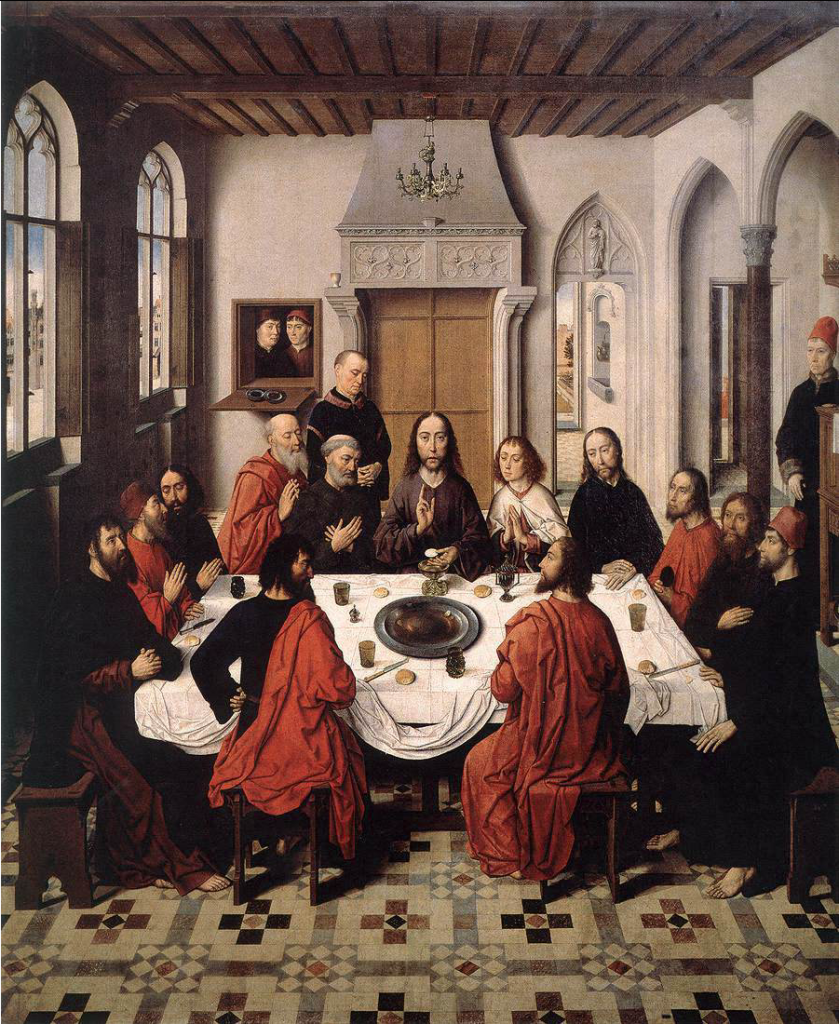 A última ceia de Deiric Bouts mostra Cristo e seus discípulos em um salão típico do século XV em Flandres (atual Bélgica).