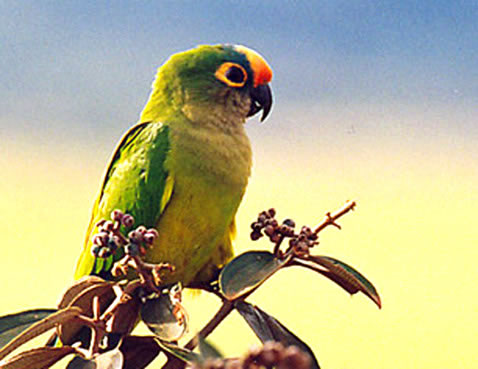 Periquito-da-cabeça-amarela – também é chamado de Jandaia – este, pode-se dizer que é um periquitão! Chega a 32 cm! Maior do que a tradicional régua de 30 cm. Os periquitos-da-cabeça-amarela gostam de um clima mais quente. Então moram principalmente no Nordeste do Brasil, nos seguintes estados: Maranhão, Piauí, Ceará e Pernambuco. Assim como os Periquitos-do-rei eles gostam de voar em bandos, estão sempre afiando os seus bicos, falam entre si o tempo todo, fazendo bastante barulho. Uma verdadeira algazarra.