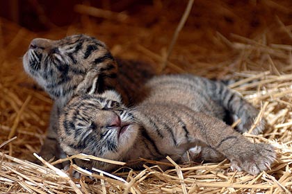 Dois filhotes de tigres-da-Sumatra, uma espécie ameaçada de extinção, são apresentados ao público na Ilha do Tigre, que faz parte do parque Dreamworld, na Costa Dourada australiana.