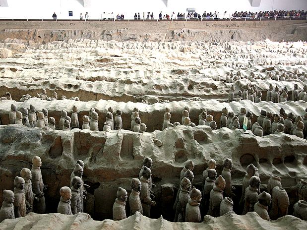 A primeira escavação começou em 1978 e terminou em 1984 e 1.087 figuras foram encontradas. A segunda foi realizada em 1985, mas foram suspendidas por razões técnicas. Os Guerreiros de Terracota fazem parte do mausoléu construído em homenagem à morte do primeiro imperador chinês, Qin Shihuang (259 a 210 a.C.). Na crença de que precisaria de um exército e demais componentes numa outra vida o imperador foi enterrado com um exército de guerreiros de mais de oito mil figuras de soldados, músicos, concubinas, oficiais e cavalos em tamanho natural. O exército de 2 mil anos é considerado pelos pesquisadores como um dos achados arqueológicos mais importantes do mundo e uma das principais atrações da China.