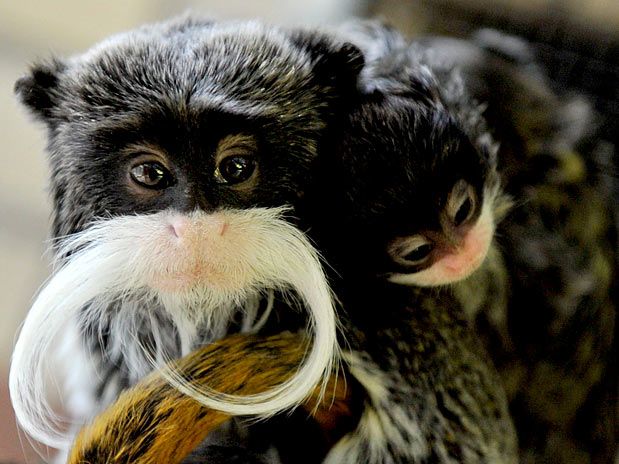 Gêmeos de sagui bigodeiro nasceram nesta quinta-feira, 28, no zoológico de Hanover, na Alemanha. Na imagem, o pai, Fritz, carrega ambos dentro de sua área no zoo.