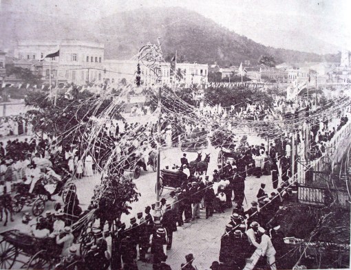 Batalha de Confete na Avenida Beira-Mar, no Rio de Janeiro, em 1907. Foto sem autoria, em: Kósmos, revista artística, científica e literária, Ano IV, número 2, Fevereiro de 1907, Rio de Janeiro.