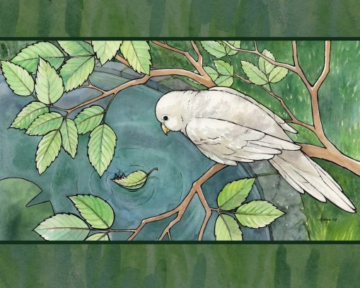 Uma pombinha branca, que estava com sede, desceu à beira de um riacho. Procurava um bom lugar para beber água.  Eis que avista uma formiguinha debatendo-se nas águas do riacho, prestes a se afogar.