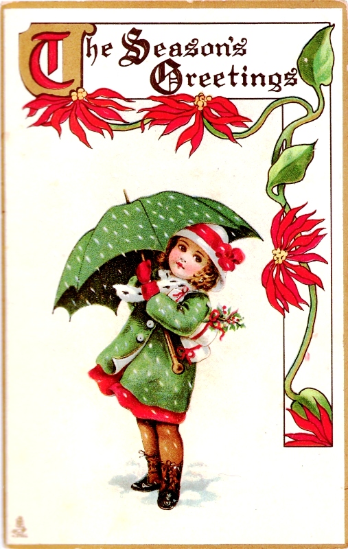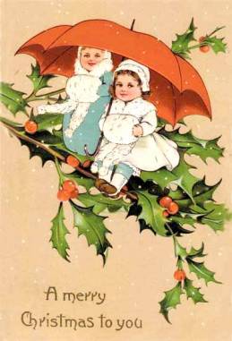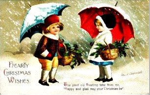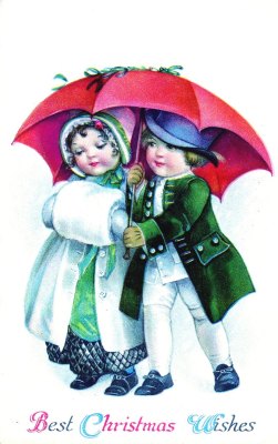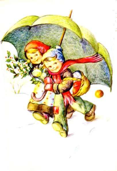 O cartão acima, cujo desenho é provavelmente de origem alemã, dadas as semelhanças entre as crianças e as peças de porcelana decorativa Goebel, é um caso que parece demonstrar exatamente isso, num campo enorme de branco temos as carinhas dos nossos personagens colocadas numa moldura feita pelo semi-círculo do guarda-chuva que os abriga. Este parece ser o caso em diversos cartões colocados a seguir: