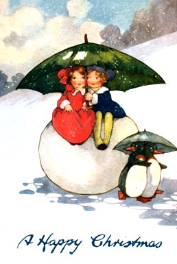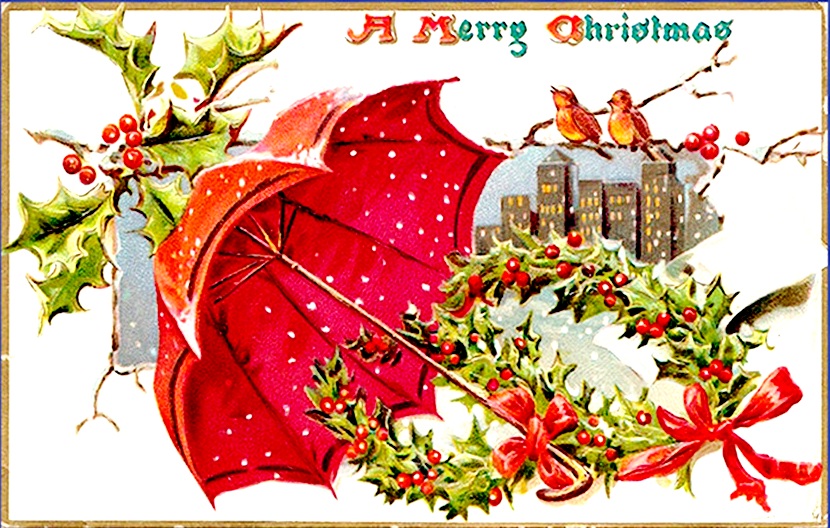 Nos muitos e muitos anos que morei fora do Brasil, no hemisfério norte, pude verificar a ineficiência de um guarda-chuva como abrigo para a neve. Na maior parte das vezes a neve não cai diretamente de cima para baixo como uma chuva pesada de verão. Mais vezes do que se imagina, a neve mais ou menos que flutua, caindo levemente como se fosse feita de pluminhas, sem peso, indo em direções múltiplas, podendo até subir dependendo da brisa. É, sem dúvida, uma surpresa ver a quantidade de vezes em que o guarda-chuva é um elemento usado nos cartões de Natal.