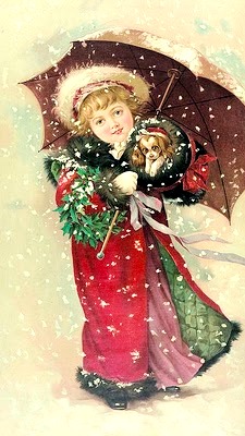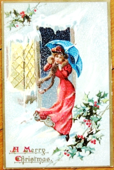 Vejamos, uma paisagem com neve, com campos, telhados, árvores, tudo com neve, é um campo de brancos. É um estudo nos diversos tons da cor branca e o guarda-chuva, oferece um pequeno campo de contraste, de uma cor forte que pode servir de fundo para a cena principal como mostra esse cartão de Natal francês.