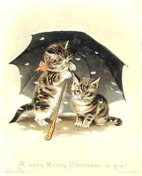 Até os pássaros e os gatinhos precisam se proteger com um guarda-chuvas no Natal