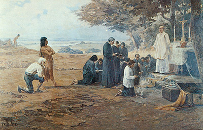 Aí, nessa data, foi dita a primeira missa, tendo a casa tomado o nome de Colégio de São Paulo de Piratininga, em razão do santo do dia. O lugar que era antes a aldeia de Piratininga, da qual era chefe Tibiriçá, achava-se quase na foz do riacho Anhangabaú, ao desembocar este no Tamanduateí, com um promotório de terra vestido de vegetação rala, que avançava ravinoso e íngreme sobre a várzea do Tamanduateí.