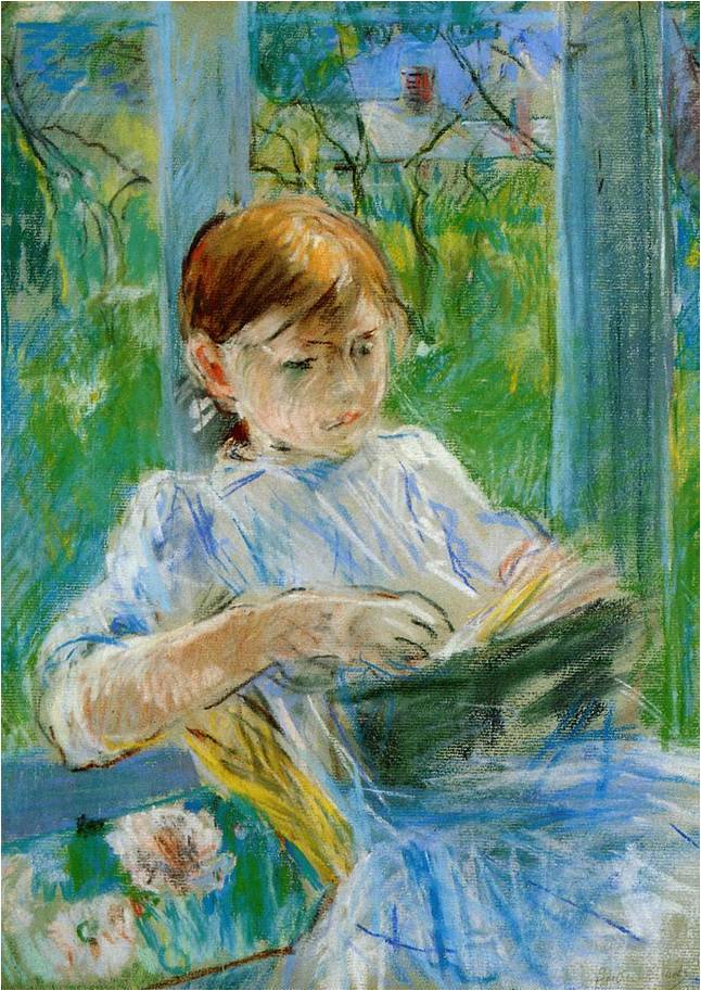 Berthe Morisot ( 1841-1895) pintora francesa impressionista. Subestimada por quase um século, provavelmente por ser mulher, ela tem hoje postura tão grande quanto de qualquer impressionista francês. Sua arte é arrojada, delicada e vigorosa, de uma modernidade evidente. Entre as pintoras impressionistas, algumas de muito valor, a maior importante talvez tenha sido Berthe Morisot, pintora de paisagens transbordantes de frescor, de traços ágeis e quase sempre com a figura humana como ponto de referência. Além disso, foi uma extraordinária pintora de cenas da vida doméstica, onde podia divertir-se e dar vazão aos seus dotes de observação, e o mesmo acontecia quando tratava com naturalidade da intimidade familiar. De personalidade forte, lutou contra os convencionalismos sociais da época, que tendiam a isolar a mulher no âmbito privado. Casada com Eugene Manet, irmão do pintor impressionista Edouard Manet, que tinha como seu melhor amigo.