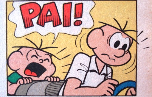 Cebolinha no carro com papai. Ilustração Maurício de Sousa.