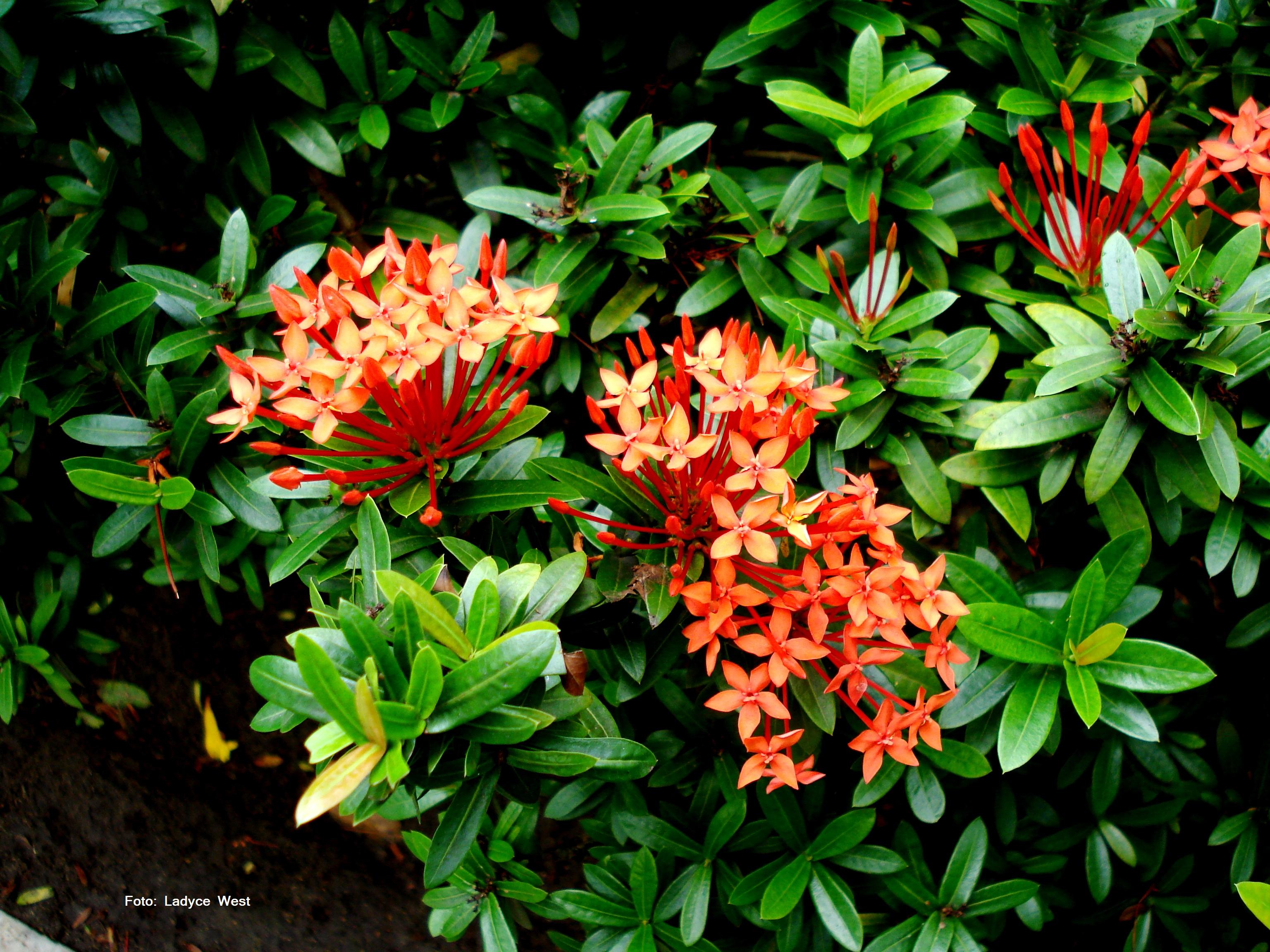 Aqui no meu bairro, no Rio de Janeiro, há uma abundância de jardins de edifícios residenciais floridos o ano inteiro com essa planta que está em todo canto, retratada acima. Alguns a chamam de Alfinete-gigante. Mas é mais conhecida com Ixora-chinesa, ou Ixora-vermelha. Não é uma planta nativa do Brasil. É originária do Extremo Oriente: Malásia e China. É planta asiática tropical, da família das Rubiaceae. Por isso se dá tão bem no clima carioca.