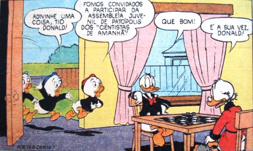 Luizinho, Zezinho e Huguinho chegam em casa com novidades.  Ilustração de Walt Disney.
