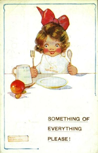 “Um pouco de tudo, por favor”, cartão postal, ilustração de Agnes Richardson (Inglaterra, 1880-1954)