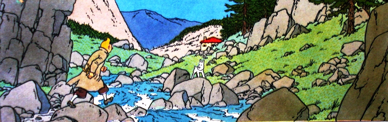 Tintim e Milu sobem o rio pedregoso, ilustração de Hergé.