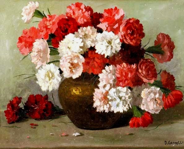 Vaso de cobre com cravos vermelhos e brancos, s.d.
