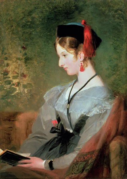 Elizabeth Wells, Lady Dyke, sentada com vestido cinza com livro nas mãos, 1831