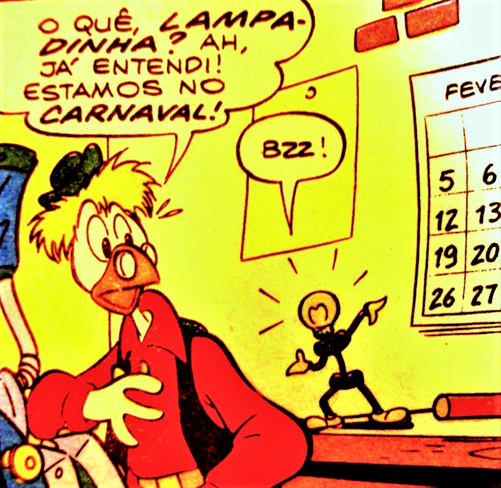 Lampadinha lembra ao Professor Pardal que já é Carnaval, ilustração Disney Studio.
