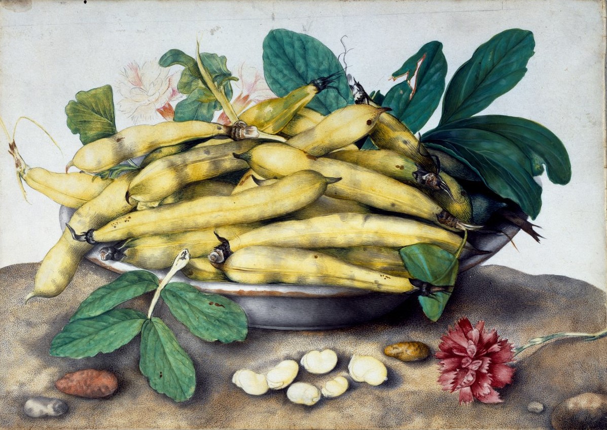 Natureza morta com feijões na fava, grãos sobre a mesa e cravo