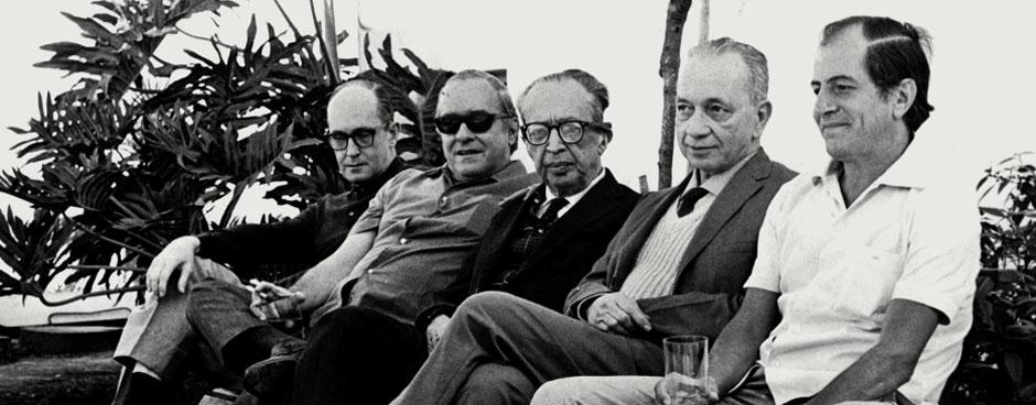 Da esquerda para a direita: Carlos Drummond de Andrade, Vinícius de Moraes, Manuel Bandeira, Mario Quintana e Paulo Mendes Campos.