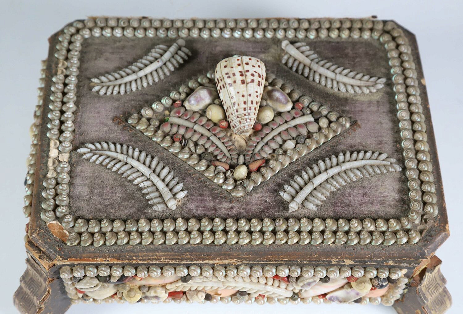 Caixa da época vitoriana [Século XIX], em madeira, decorada com conchas variadas. Origem provavelmente inglesa.
