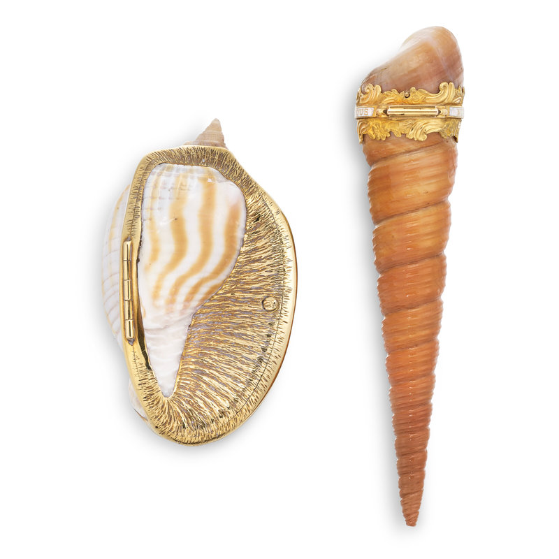 Essas são duas caixas de conchas, com montagem em ouro. A caixa à direita conhecida como Caixa de Turritella foi transformada por volta de 1765. Turritella é o nome latino para um caracol marinho, em forma de cone alongado com diversas rotações. Turritella em latim e em italiano significa pequena torre, Esta concha tem cerca de 10 cm de comprimento. Os adornos de acabamento e dobradiça de ouro mostram desenho rococó com volutas e flores e há uma faixa em esmalte branco com os dizeres ‘NUL PLAISIR SANS VOUS VOIR’ [não há prazer sem lhe ver, que bela mensagem de alguém enamorado!]. A concha cancerallia, que acompanha nesta foto a Turritella,tem a tampa forrada por dentro em ouro, cinzelado para simular a textura natural da concha e mede 9 cm no comprimento.