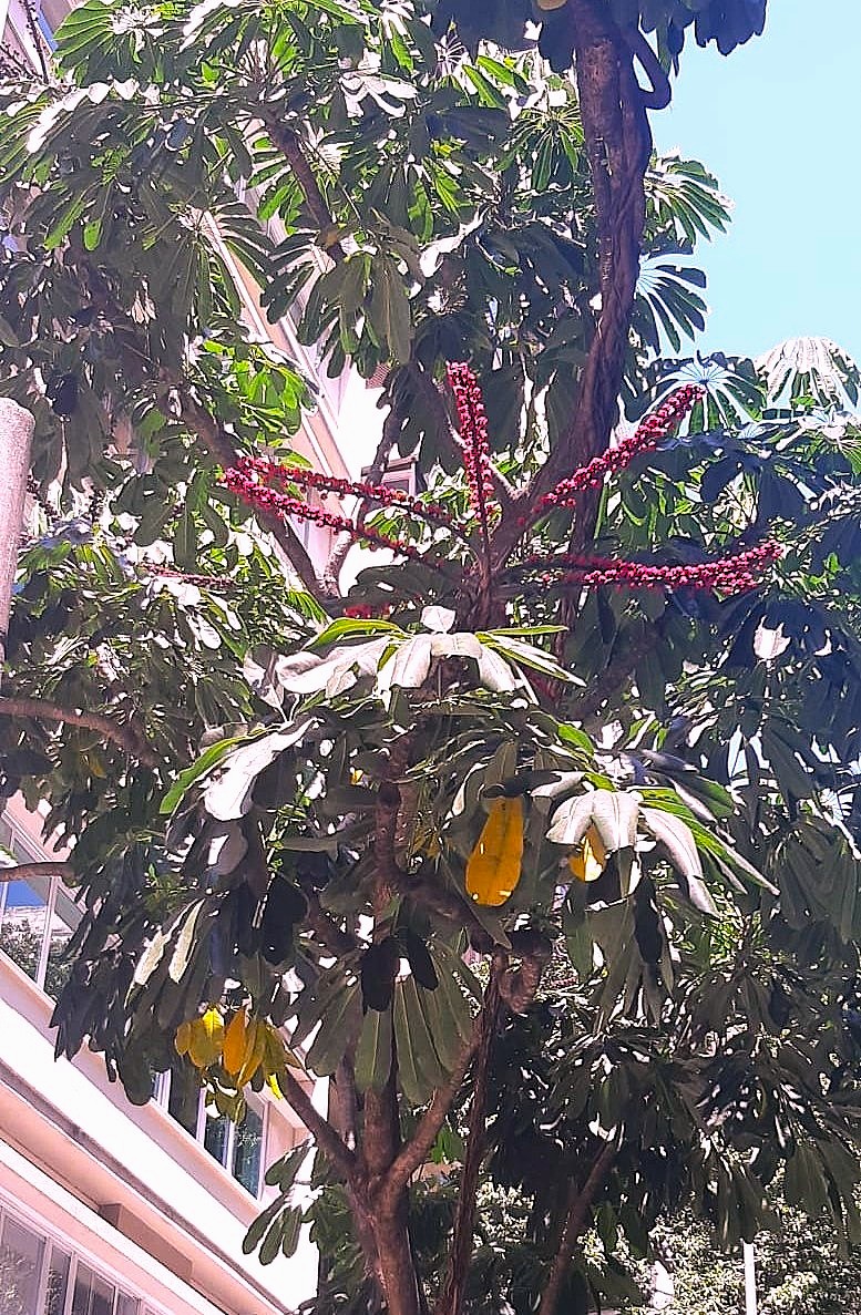 Fiquei surpresa de ser uma Schefflera. Porque as Scheffleras que eu conhecia até hoje eram arbustos. Na verdade, tive uma em vaso, dentro de casa nos Estados Unidos, por mais de 20 anos. Ela cresceu até uns 150 cm. Mas nunca deu flor, e nunca soube que daria flor.