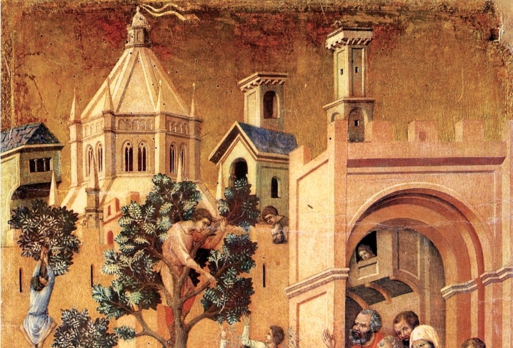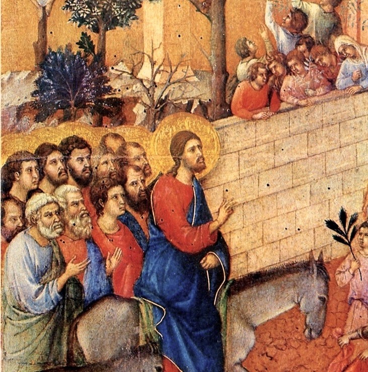 Essa cena é fora dos padrões da arte da época, porque muita atenção foi dada à paisagem com grande detalhes. O caminhos pavimentado, o portão da cidade e seus muros, batentes, as torres esguias se dominando a cidade, bastante realista. A pequena árvore sem folhas e decrépita vista por trás do halo de Jesus é a figueira que ele encontrou sem frutos. Isso indica que Duccio parece ser a fiel representação da cena encontrada no Livro V de Flavius Josephus da obra De Bello Judaico do primeiro século, muito conhecido na Idade Média.
