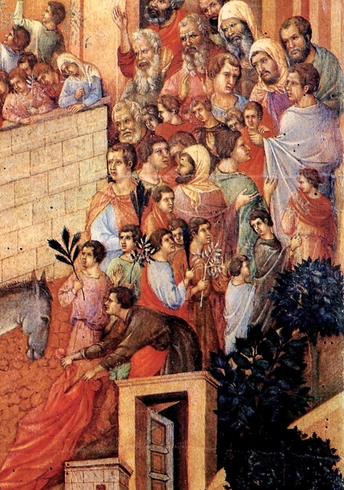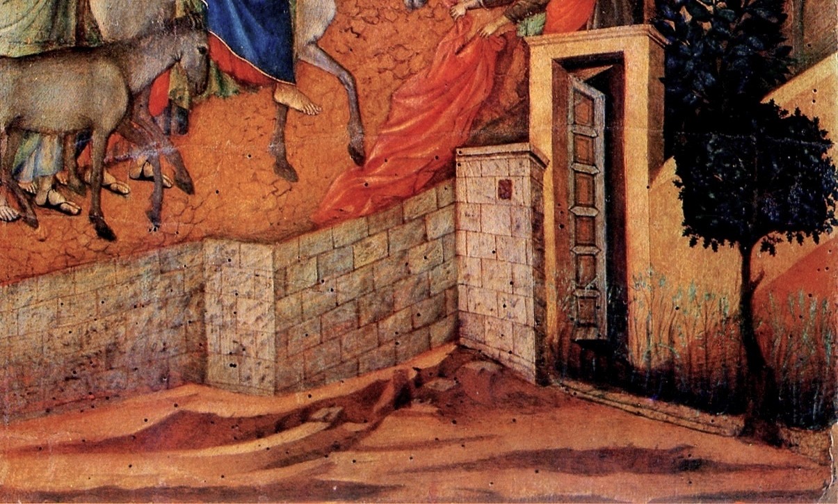 Essa cena é fora dos padrões da arte da época, porque muita atenção foi dada à paisagem com grande detalhes. O caminhos pavimentado, o portão da cidade e seus muros, batentes, as torres esguias se dominando a cidade, bastante realista. A pequena árvore sem folhas e decrépita vista por trás do halo de Jesus é a figueira que ele encontrou sem frutos. Isso indica que Duccio parece ser a fiel representação da cena encontrada no Livro V de Flavius Josephus da obra De Bello Judaico do primeiro século, muito conhecido na Idade Média.