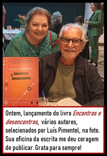 Muitas vezes não sabemos o impacto que nossas ações podem exercer sobre outras pessoas. Fui levada à Oficina de Escrita do escritor Luís Pimentel pelas mãos de uma amiga, Magali Lee Cotrim, que estava interessada em escrever memórias. Fui, ainda sem saber bem como tudo isso funcionava. Escrever havia sido sempre parte de minha vida, ainda que fosse segredo. Manuscritos, tenho-os alguns. Talvez, por haver feito resenhas de livros para jornais e no blog, há 17 anos, algumas centenas de resenhas, meu medo de meus textos não serem bons, sempre me impediu de aparecer como escritora.