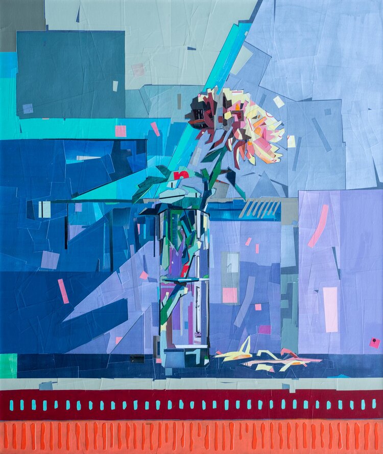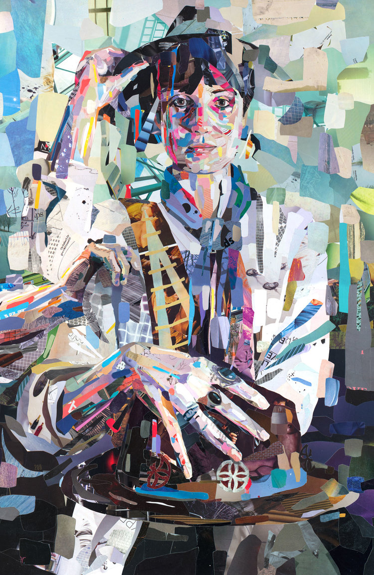 colagem, papel cortado e acrílica sobre tela. 102 x 86 cm