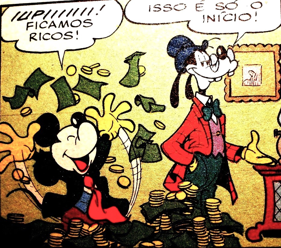 16 07 2025Mickey e Pateta comemoram bonança financeira, ilustração Walt DIsney.