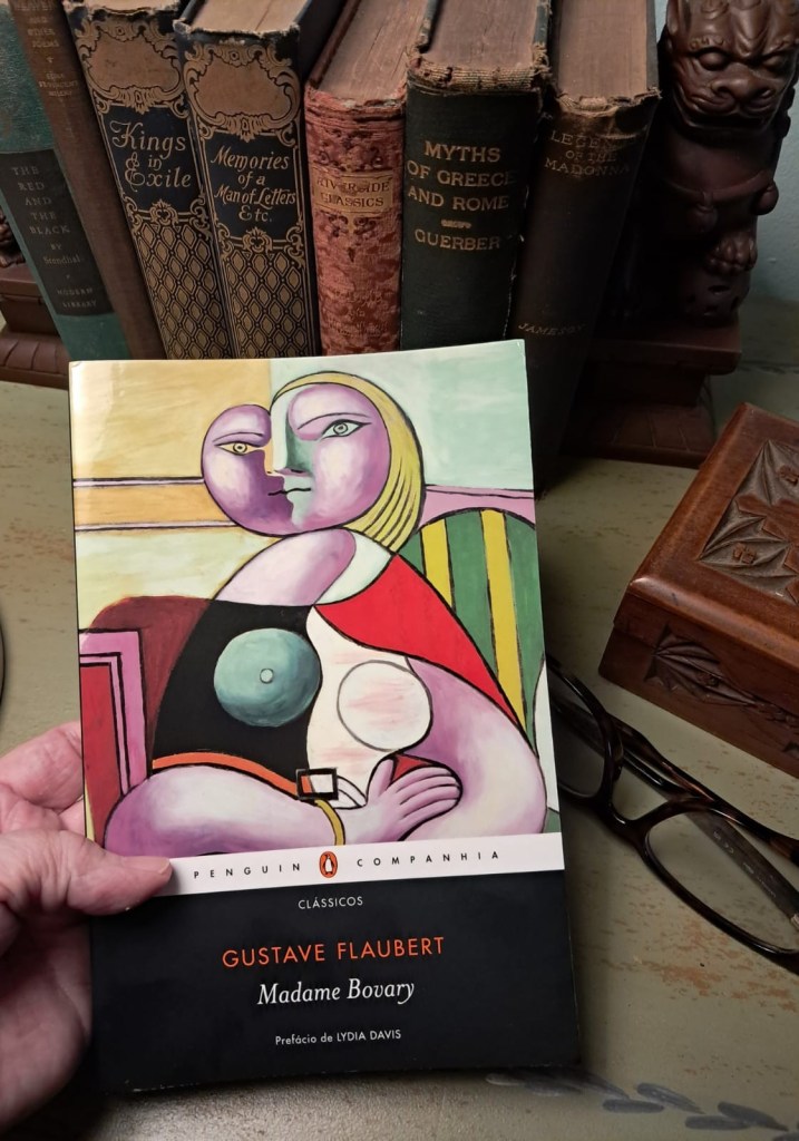 Finalmente li Madame Bovary, de Gustave Flaubert, (1857), um clássico, considerado uma das três obras mais influentes na história literária do mundo ocidental.  As outras são: Don Quixote, de Cervantes (1605) por ser considerado o primeiro romance moderno, e Ulisses de James Joyce (1922) por ter revolucionado a narrativa, incluindo o fluxo de consciência, entre outras novidades.  Nesse meio, Madame Bovary se salienta na literatura ao introduzir o realismo na narrativa literária; pela excelência na precisão das palavras; por trazer pela primeira vez uma anti-heroína, entre outros “primeiros” que esse romance introduz, incluindo a crítica social. Essa era uma falha na minha formação que me orgulho de tê-la superado. Confesso que estava um tanto intimidada ao abrir esse livro.  Tanto se fala dele.  Foi fonte de inspiração para Ana Karênina, de Tolstói publicado vinte anos mais tarde, e foi fonte de inspiração para um grande número de escritores.  Mas depois de ler O papagaio de Flaubert, de Julian Barnes, há uns poucos anos, que me encantou, percebi que precisava a qualquer custo me dedicar a Madame Bovary.  A conta havia chegado. Fui auxiliada também pelo grupo de leitura Papalivros que escolheu essa como primeira leitura de 2026.
