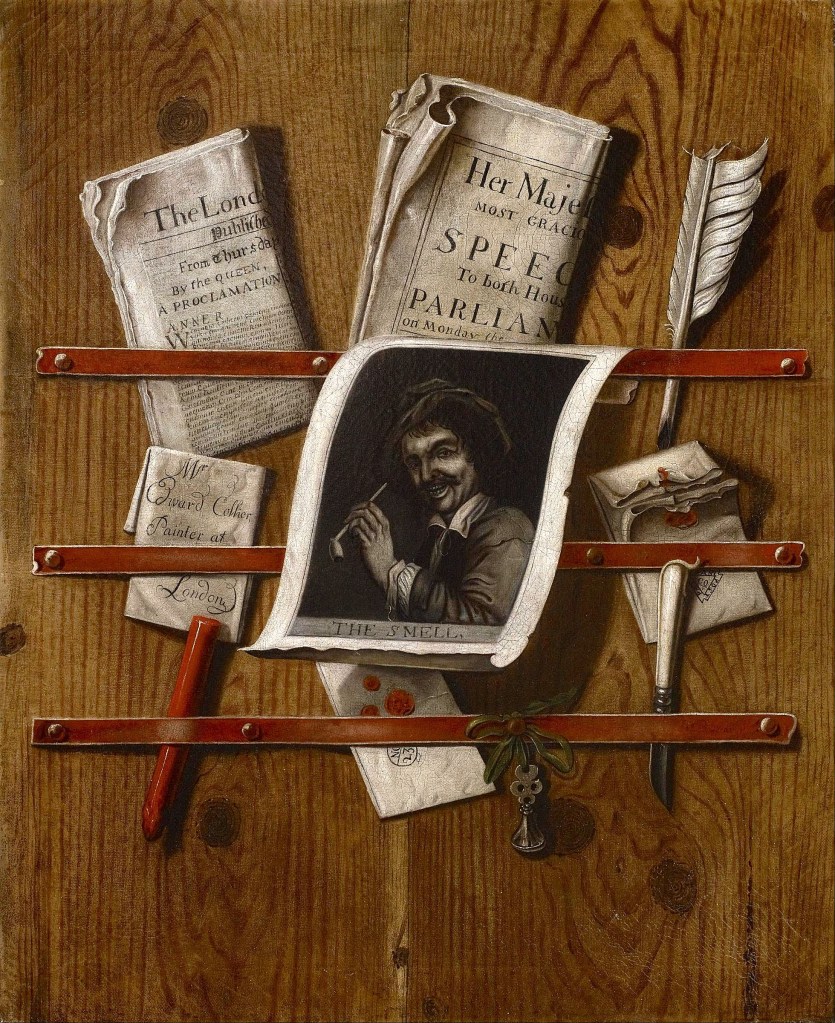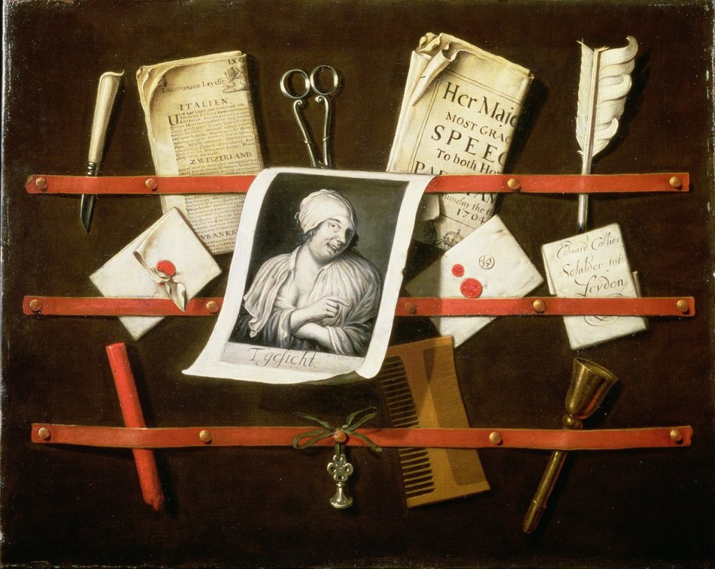 Trompe l’œil de jornais e instrumentos de escrita sobre uma placa de madeira, 1698
