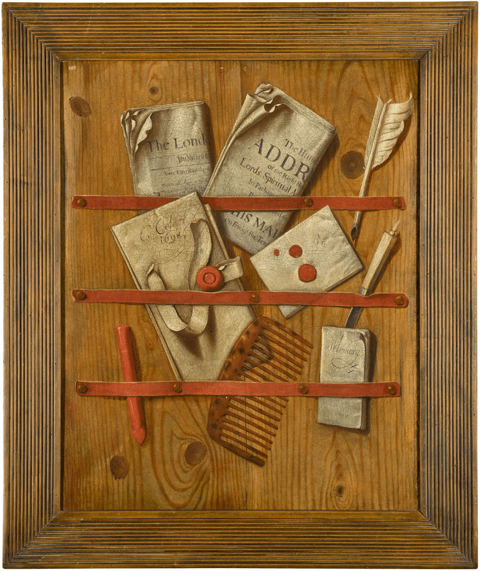 Trompe l’œil, diversos instrumentos de escrita, pente, jornais, 1696