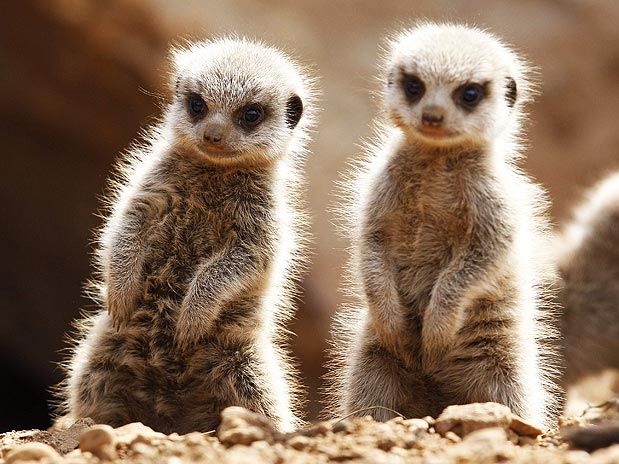 Dois filhotes de suricates são vistos no zoo de Chester, norte da Inglaterra. Os animais, com três semanas de idade, foram apresentados ao público pela primeira vez.