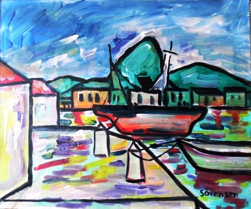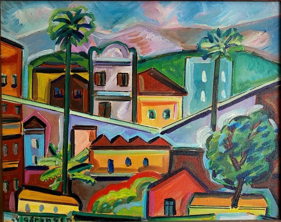 Temos aqui duas obras com o mesmo assunto: vegetação densa, rio e casas. Pequenas cidades. Vilarejos. Ambas as telas trazem ao espectador variadas emoções. Apesar de quase caótica, a cena da tela de Inimá de Paula nos traz equilíbrio pelo uso abundante das tonalidades de azul e verde, cores calmas, ainda que intensas em seu volume. Enquanto a tela de Carlos Sörensen com grande variedade de cores explosivas, concentradas no leque dos tons avermelhados, encontra equilíbrio nas ‘quase monótonas’ horizontais. Vejam que elas também são linhas rebeldes que quase não querem ser horizontais. Mas, cortando a tela em fatias visuais elas baixam a excitação visual de todos os vermelhos, laranjas, lilás e demais cores que excitam o nosso olhar.