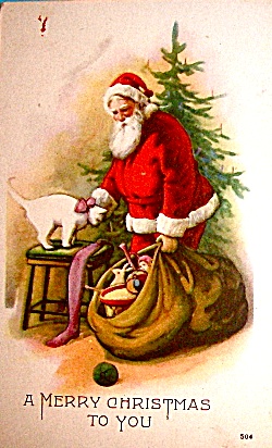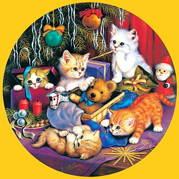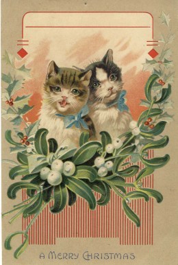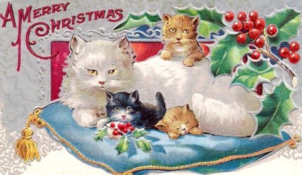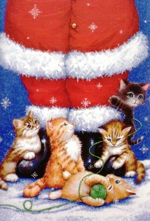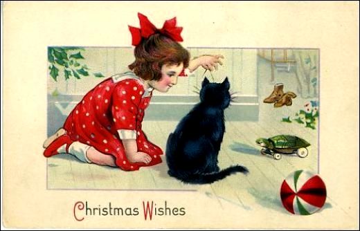 São muito poucos os gatinhos interagindo com alguém, nos cartões de Natal. E quando aparecem com um ser humano em geral é uma menina. Fato é que não tenho um único cartão de Natal, ou postal em que um menino esteja brincando com um gatinho. Isso, entre 3128 imagens de cartões de Natal. Interessante, não é mesmo?
