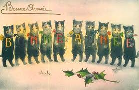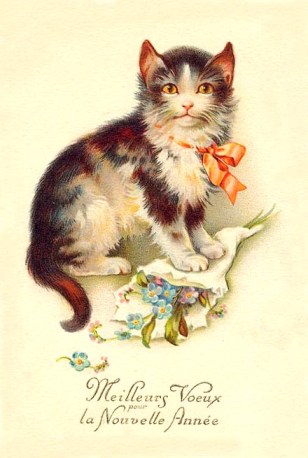 NOTA: Na minha coleção de imagens de cartões de Natal e postais, um pouco mais de 3000 imagens, hoje, há mais cartões franceses com gatinhos do que de qulauqer outro país. Mas há uma curiosidade que não abordei aqui e que ficará para a próxima oportunidade: os franceses são adeptos da personificação do gato, ou seja eles representam os gatinhos como humanos, fazendo coisas humanas, como namorar, jogar bola de neve, etc. Essa personificação acontece em todos os países, mas os franceses se destacam. É uma avenida interessante para se explorar no estudo da iconografia. Aqui fica um exemplo: