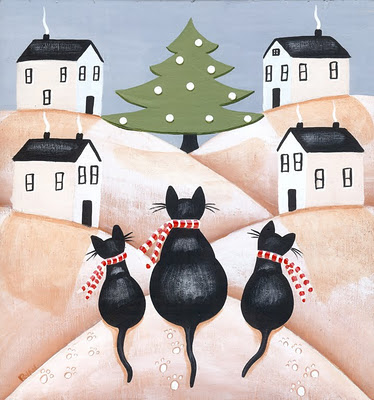 Mais moderno, gosto de ver os três gatinhos de cachecol olhando para a árvore de Natal ao fundo. Uma simetria tranquila, apesar de sabermos que logo logo esses bichanos irão embora, afinal, onde está o quentinho nesse monte de neve?
