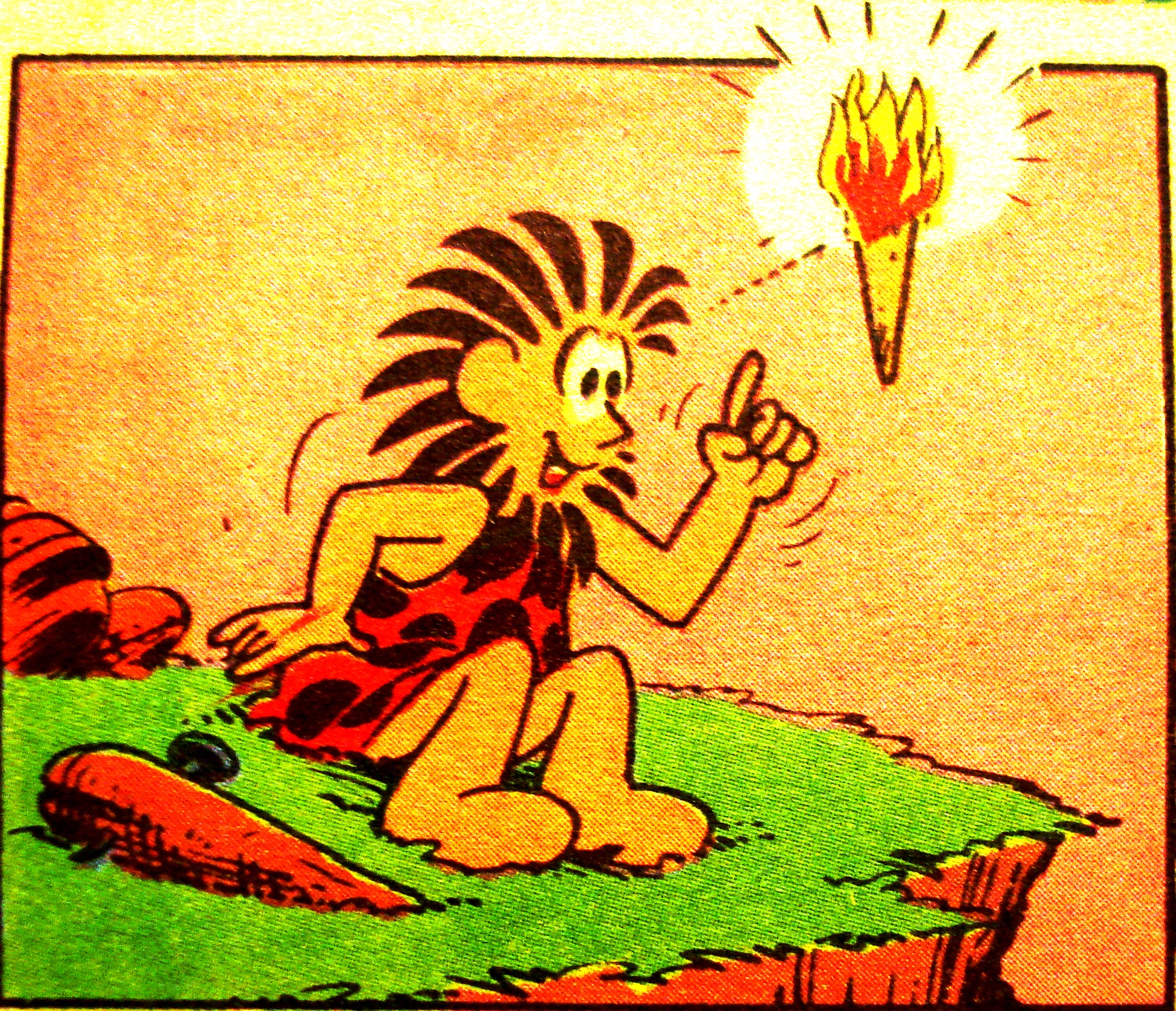 Piteco, o homem das cavernas tem uma ideia de acordo com os seus tempos, nem poderia ser diferente. Será que elas seriam tão brilhantes quanto as de raio laser?