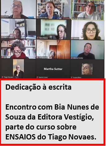 Boa parte do meu dia hoje foi dedicada aos ensaios. Estou desde o início do ano fazendo o curso de escrita de ENSAIOS com o escritor Tiago Novaes. Hoje foi um dia diferente e importante, encontro com Bia Nunes de Souza, da Editora Vestígio que se dedica à publicação de ensaios tanto de autores brasileiros quanto estrangeiros. Aprendi muito com ela, e saí de sua palestra me sentindo incentivada a prosseguir com uma série de pequenos ensaios sobre comportamento, que eventualmente irei publicar. Impressionante como às vezes uma palavra, uma imagem, um sorriso, podem subitamente acender ideias, dar ânimo, empurrar quem trabalha sozinho. Aquela nova energia desce como num flash. Nunca sabemos o suficiente para não poder aprender um pouco mais.