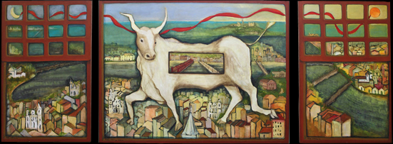 Momentos depois o chavelhos de um boi surdiram na janela e depois do chavelhos o pescoço e depois do pescoço o resto. Toda a gente reconheceu:… era o bovino do Melchior. E o diabo do bicho foi subindo, subindo e caminhando devagarinho no ar, como se tivesse voando na direção do sobrado fronteiro.