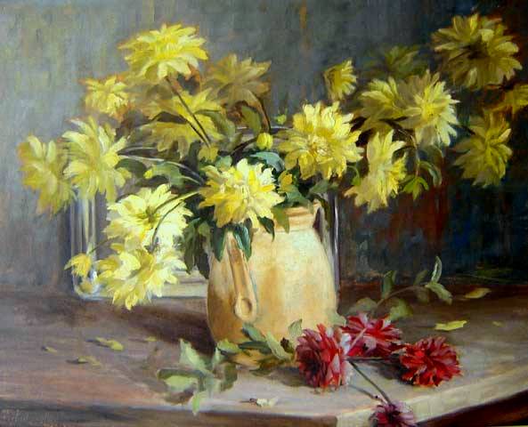 Natureza morta, cebolas, chuchu, beterraba, couve-flor, repolho, cesto e garrafão, sobre a mesa