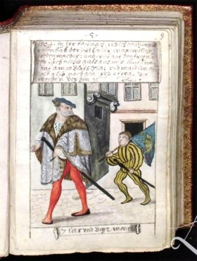 Há detalhes interessantíssimos nas aquarelas e nas descrições: numa das páginas vemos Matthäus com meias vermelhas, acompanhado de um menino, aprendiz de bobo da corte, com um macacão amarelo, com listras pretas. E aprendemos também, um pouquinho sobre nós mesmos, sobre a nossa cultura brasileira: Ulinka Rublack menciona no seu artigo, quando Matthäus saía para cortejar uma donzela levava consigo uma bolsa no formato do coração e da cor verde da esperança. Portanto a expressão em português usada aqui no Brasil e em Portugal “verde é a cor da esperança” já era usada na Europa no século XVI.