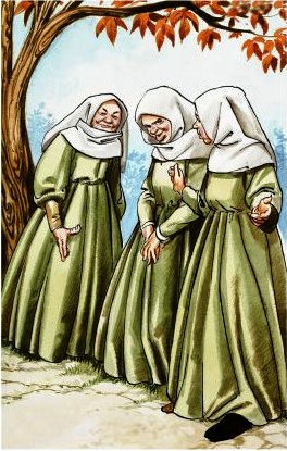 Elas entregaram-se à obra; a primeira fazia girar a roda; a segunda molhava o fio, a terceira torcia e apoiava-o na mesa com o polegar.