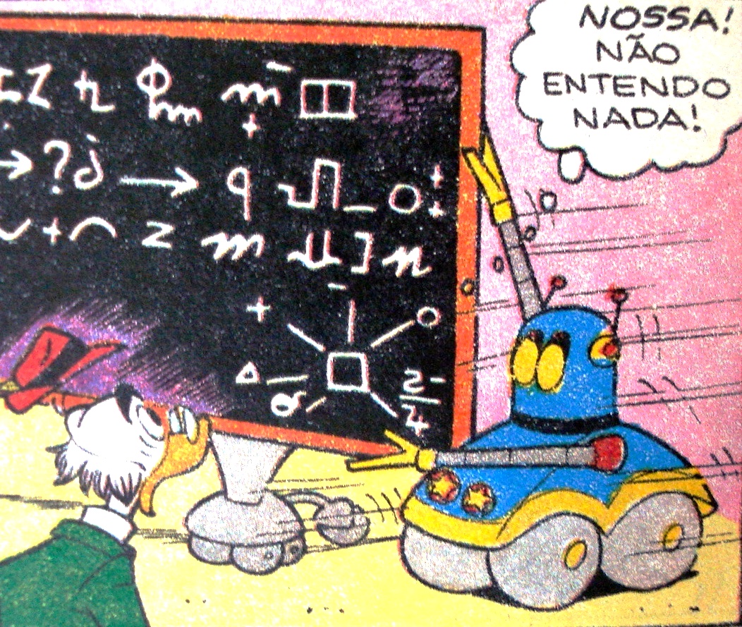 O robô traz a solução de um problema para o Professor Ludovico, ilustração Walt Disney.