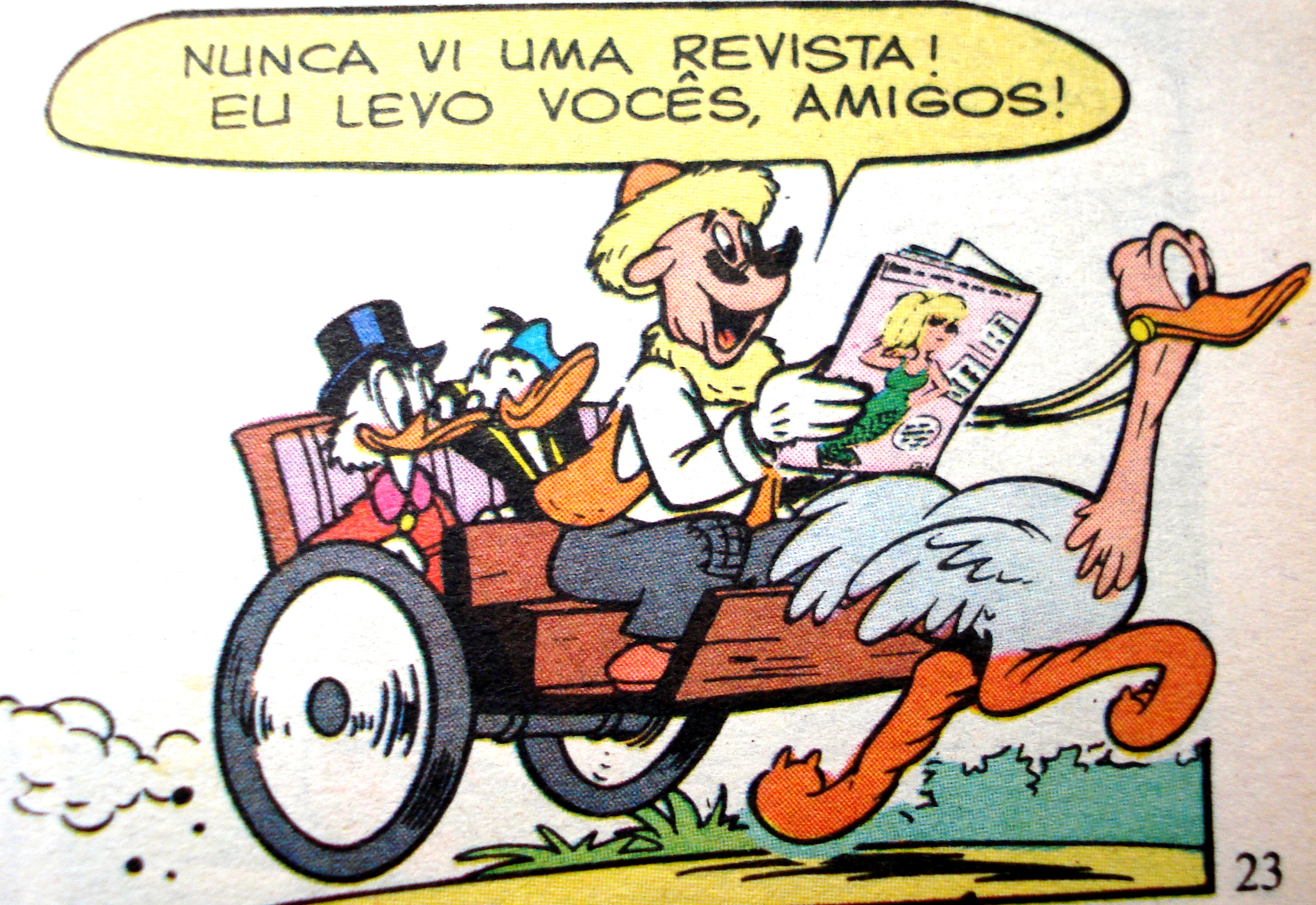 Tio Patinhas e Pato Donald, ganham uma carona graças à revista que deram de presente ao carroceiro em um lugar longínquo, ilustração Walt Disney.