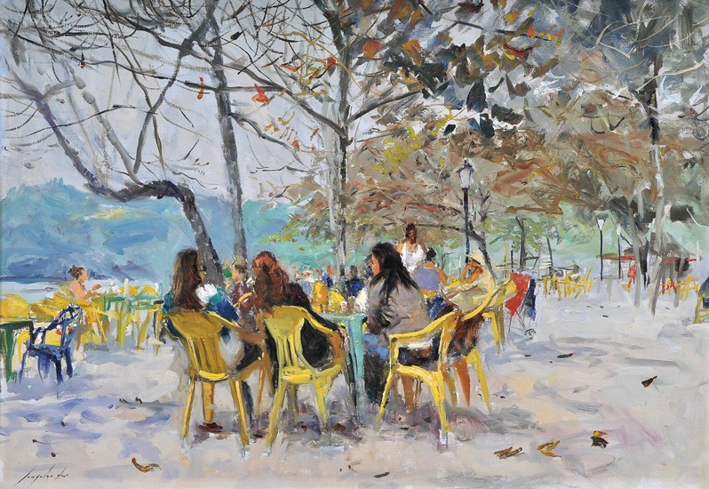 Henri Le Sidaner era um pintor francês nascido em nas Ilhas Maurício. Um pintor do que chamamos a segunda geração de impressionistas franceses. Criou um mundo só dele, encantado, em que grande parte de suas telas — não todas — apresentam lugar romântico, com uma Natureza Morta com dimensões maiores do que o normal, incluindo mesas e cadeiras, em lugares em varandas, pátios antigos, lugares de encontros amorosos? ou de amigos? todas localizações encantadas.