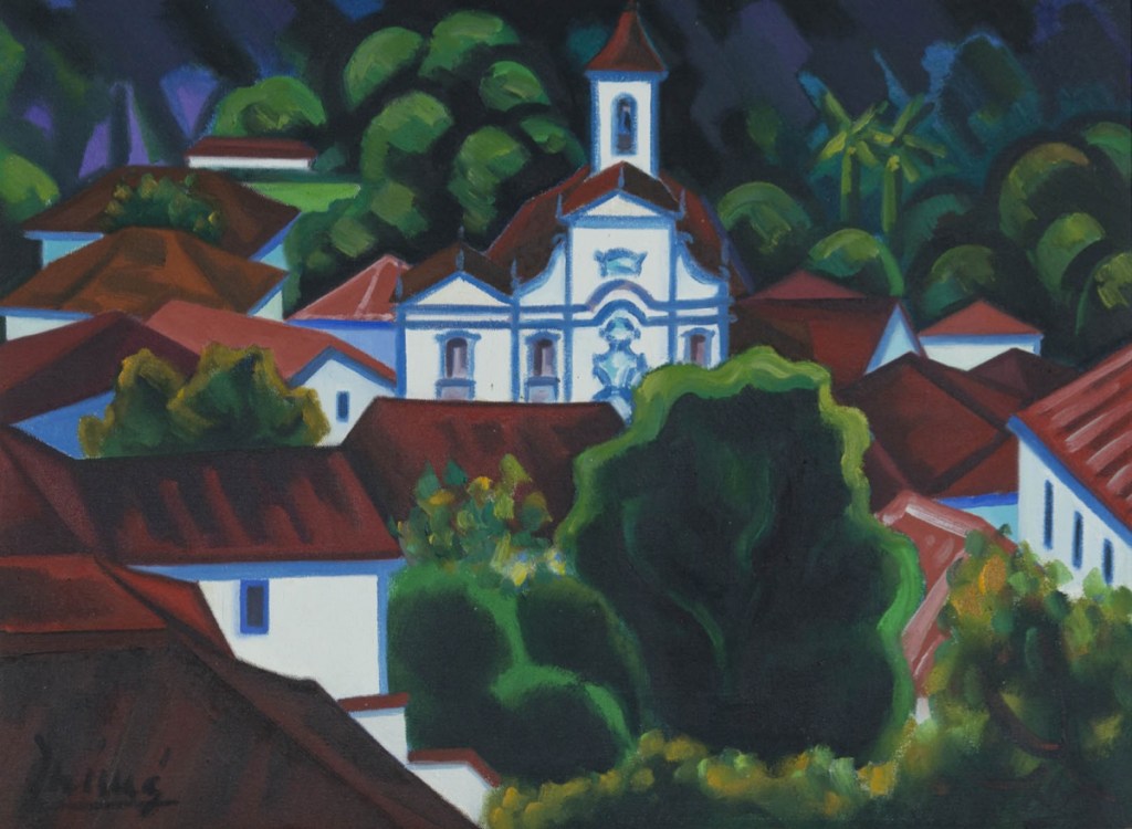 Temos aqui duas obras com o mesmo assunto: vegetação densa, rio e casas. Pequenas cidades. Vilarejos. Ambas as telas trazem ao espectador variadas emoções. Apesar de quase caótica, a cena da tela de Inimá de Paula nos traz equilíbrio pelo uso abundante das tonalidades de azul e verde, cores calmas, ainda que intensas em seu volume. Enquanto a tela de Carlos Sörensen com grande variedade de cores explosivas, concentradas no leque dos tons avermelhados, encontra equilíbrio nas ‘quase monótonas’ horizontais. Vejam que elas também são linhas rebeldes que quase não querem ser horizontais. Mas, cortando a tela em fatias visuais elas baixam a excitação visual de todos os vermelhos, laranjas, lilás e demais cores que excitam o nosso olhar.