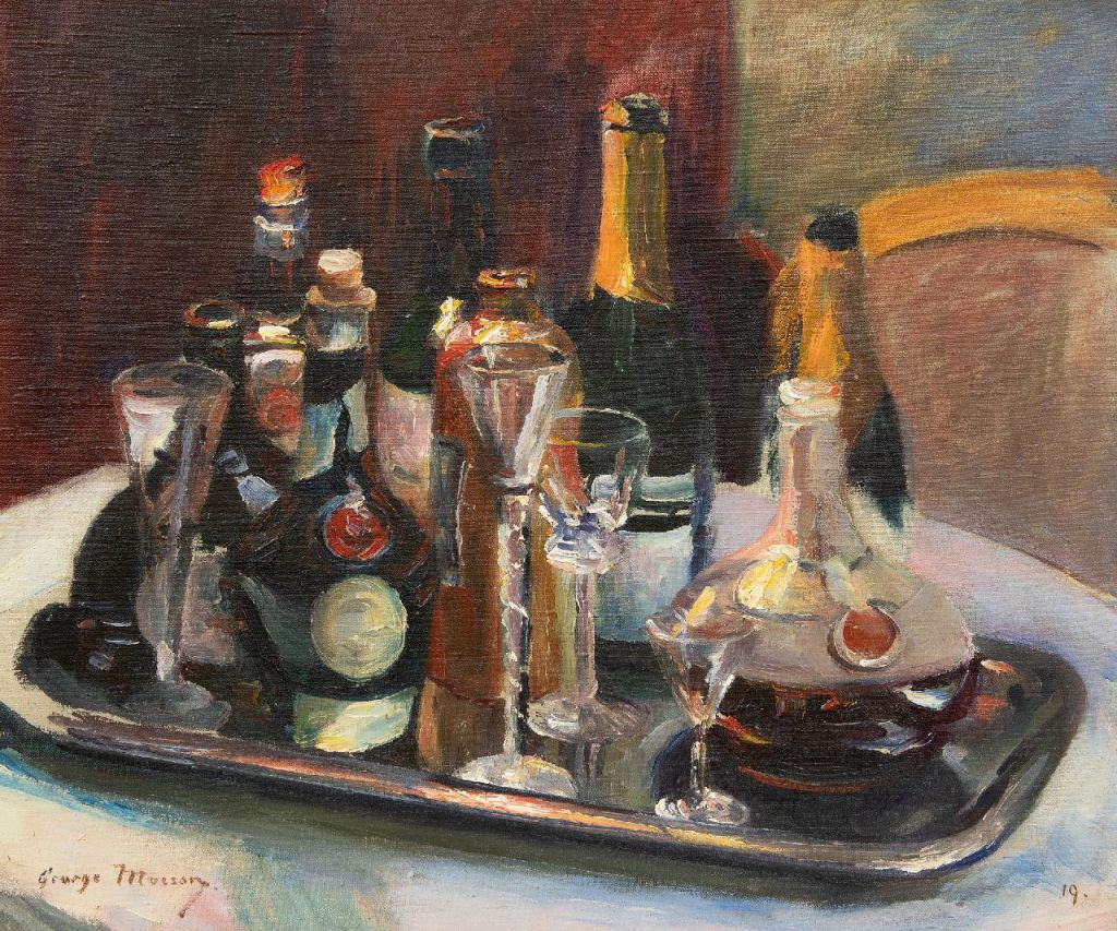Natureza morta com licor Bénédictine, garrafas e taças, 1919